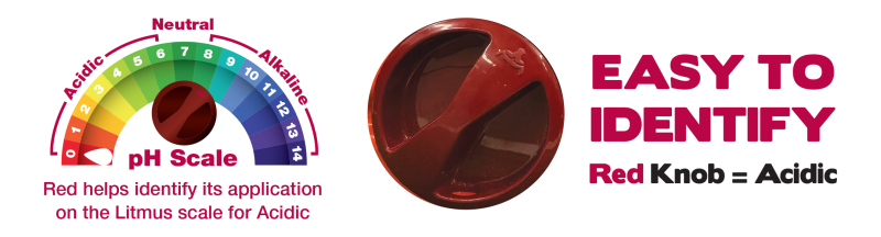 Red means acidic on the pH scale. When you see our Red Knob, you know it’s safe to use with acid-based cleaners.