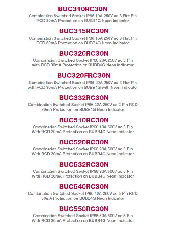 The Buffalo combination range includes three-pin 10A and 15A, as well as five-pin 10A, 20A, 32A, 40A and 50A modular designs, all with neon indicators and pre-wired with Wolverine 30mA RCD protection.