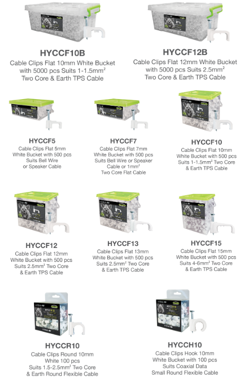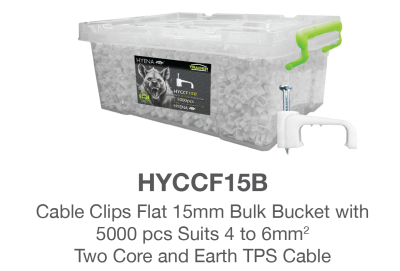 Better value and perfect for volume installs, HYCCF15B clips suit 4 to 6mm2 Two Core & Earth TPS Cable and are made from high-density HDPE and Zinc plated hardened steel.