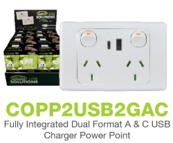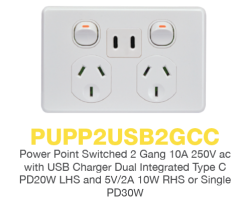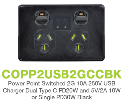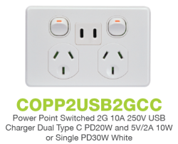 Still, the preferred switch plate design in many parts of Australia, COPP2USB2GCC gives you an integrated DGPO plus two Type C ports blasting out a total of 30W, ideal for your new iPhone 17, Google Pixel 10 & Samsung Galaxy S25 Ultra.