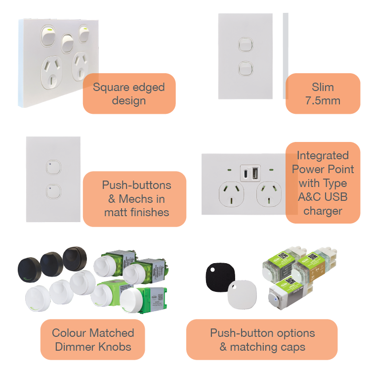 Matt options include matt coloured mechs, dimmer and fan knobs, Type A&C USB charger, push-buttons and even Powermesh.