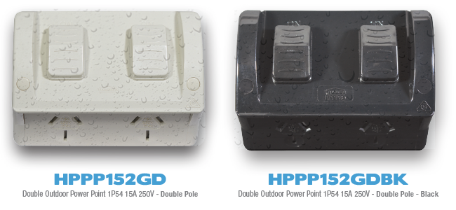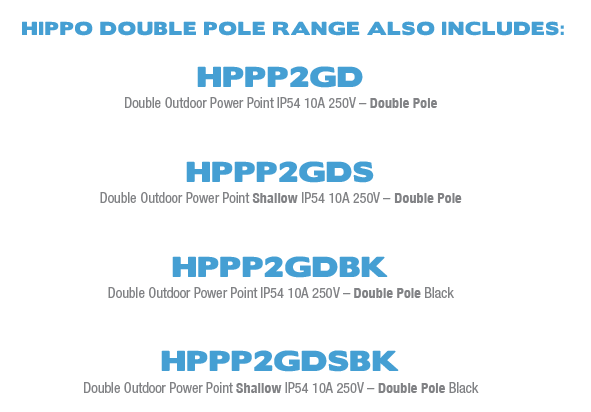 Our Hippo IP54 rated outdoor range is now available in a 15A double power point and double pole.