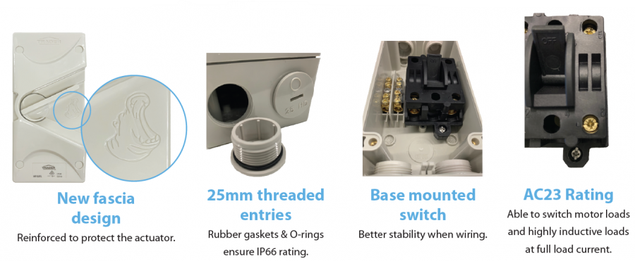 switch actuator to survive hard knocks. Motor rating? A mighty M180. Inductive loads? The AC23A rating