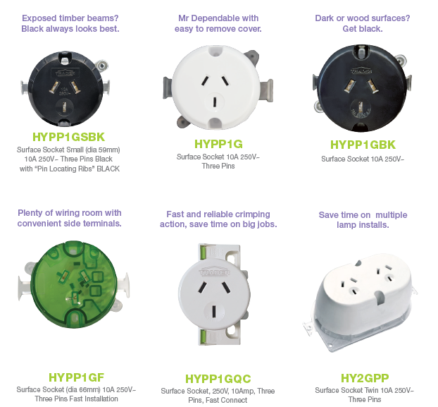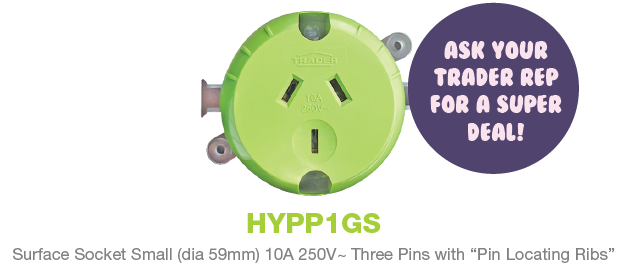 The Trader brand has been a real bonus to the electrical field. Especially, can I highlight the HYPP1GF (surface socket). These are perfect for retrofitting existing lighting where you pull out old downlights or changing over from a batten holder to downlight etc. The terminals are all in a row with a well thought insulation barrier which must be ‘clicked in’ before you can fit the base. Then there’s the ‘easy fit’ base. When I say easy fit, it’s easy to fit and to take off again should you need to. (hopefully no more screwdrivers through my hand trying to remove bottom plates etc). They easily fit through a normal downlight cut out, so you can work from a ladder instead of having to go in the roof, even with a few cables and cable ties attached etc. Circuit identification is becoming more and more important. Trader realise this and have added space on the front of the socket outlet to 2 – IPA labels visible even with a plug in the socket.