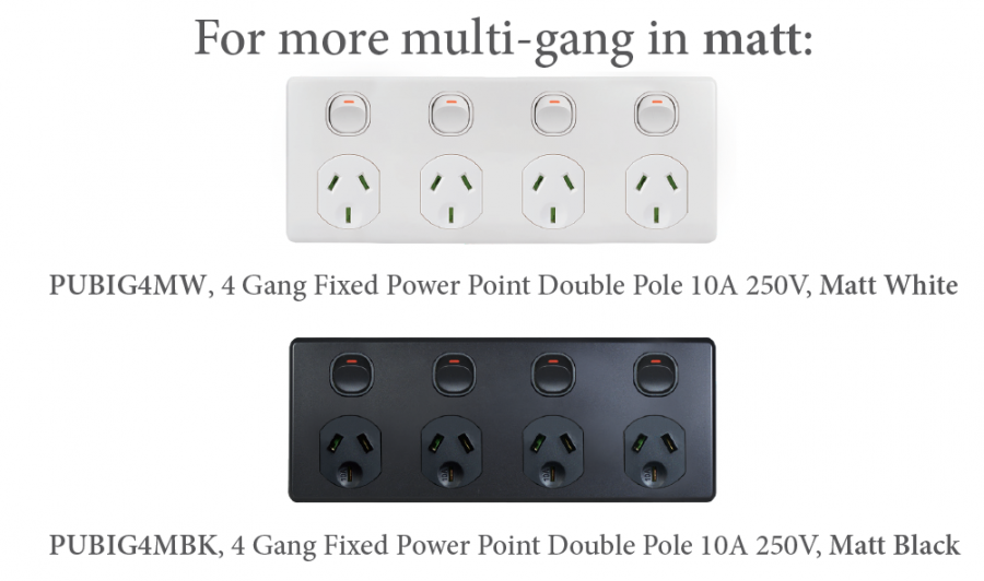 Designed to mattch the latest trends in matt paint finishes, tapware, handles and appliances, now your multi-gang sockets can mattch up too.