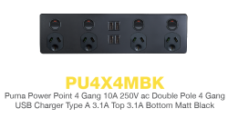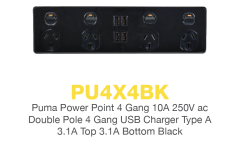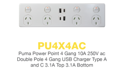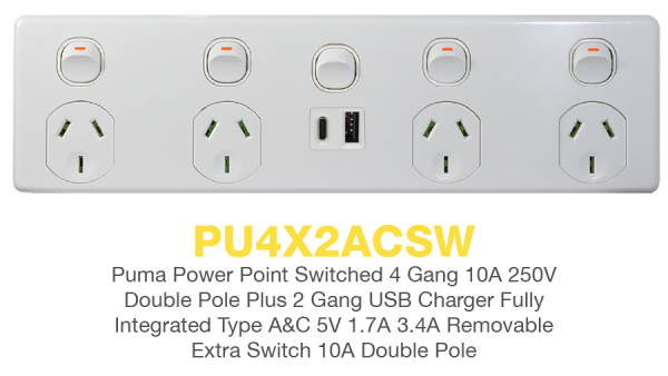 Our New Puma PU4X2ACSW now combines 4 double pole power outlets, a built-in Type A&C USB charger and a Removable Extra Switch all designed to fit standard mounting centres.