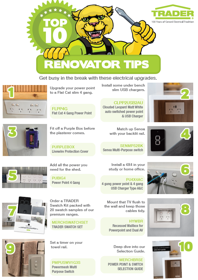 The Trader brand has been a real bonus to the electrical field. Especially, can I highlight the HYPP1GF (surface socket). These are perfect for retrofitting existing lighting where you pull out old downlights or changing over from a batten holder to downlight etc. The terminals are all in a row with a well thought insulation barrier which must be ‘clicked in’ before you can fit the base. Then there’s the ‘easy fit’ base. When I say easy fit, it’s easy to fit and to take off again should you need to. (hopefully no more screwdrivers through my hand trying to remove bottom plates etc). They easily fit through a normal downlight cut out, so you can work from a ladder instead of having to go in the roof, even with a few cables and cable ties attached etc. Circuit identification is becoming more and more important. Trader realise this and have added space on the front of the socket outlet to 2 – IPA labels visible even with a plug in the socket.