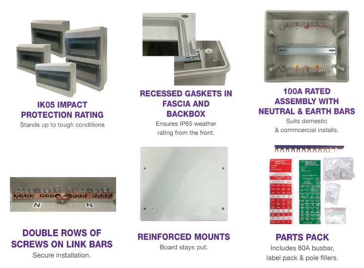 With hard wearing recessed gaskets and UV stable reinforced construction, know that our IP65 rated enclosures are made to last. Available in 9 way, 12 way, 18 way and 24 way sizes.
