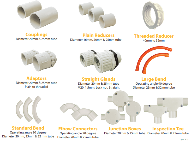 The range includes couplings, reducers, glands, elbows, junction boxes and inspection tees.