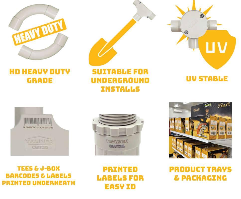 Our range of Trader Cobra Conduit Fittings keeps growing, now with more elbows, bends and couplings.