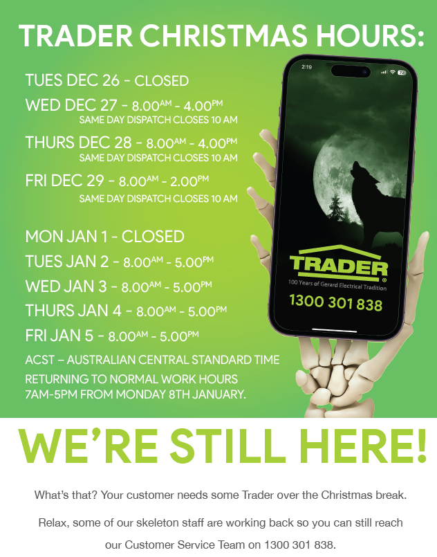 The Trader brand has been a real bonus to the electrical field. Especially, can I highlight the HYPP1GF (surface socket). These are perfect for retrofitting existing lighting where you pull out old downlights or changing over from a batten holder to downlight etc. The terminals are all in a row with a well thought insulation barrier which must be ‘clicked in’ before you can fit the base. Then there’s the ‘easy fit’ base. When I say easy fit, it’s easy to fit and to take off again should you need to. (hopefully no more screwdrivers through my hand trying to remove bottom plates etc). They easily fit through a normal downlight cut out, so you can work from a ladder instead of having to go in the roof, even with a few cables and cable ties attached etc. Circuit identification is becoming more and more important. Trader realise this and have added space on the front of the socket outlet to 2 – IPA labels visible even with a plug in the socket.