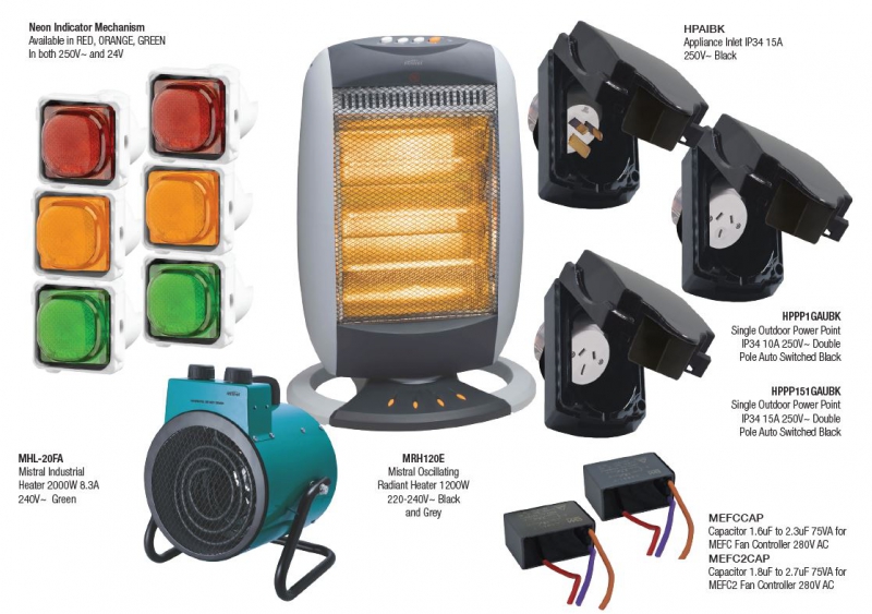 Trader’s new products include caravan and mobile home inlets and outlets, neon indicator mechanisms, heaters, and fan capacitors.