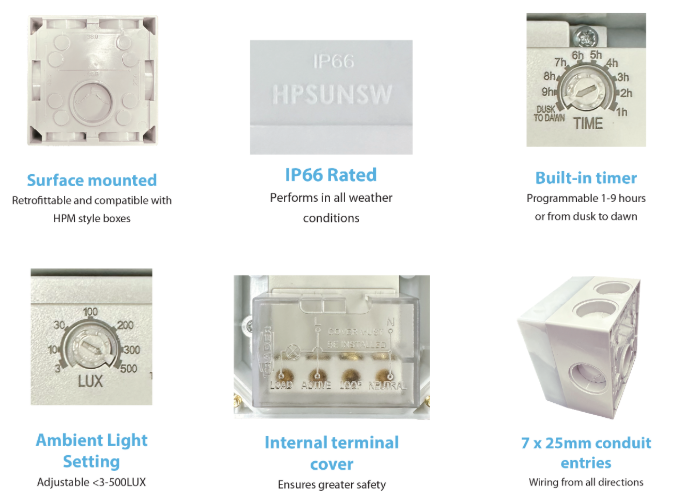 Simply adjust the lux levels to the required light level and set the timer for up to 9 hours of lighting or until the sun rises again. Rated IP66, the sunset switch will give you years of reliable use. Hippo’s enclosure design is also retrofittable/compatible with HPM* style sunset switch boxes.