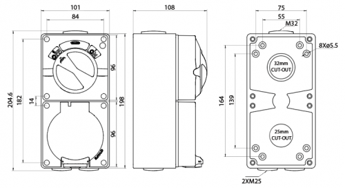 Buffalo offers an extensive range of IP66 rated Combination Switched Sockets that are available in three-pin 10A to 32A, four-pin 10A to 50A and five-pin 10A to 50A designs.
