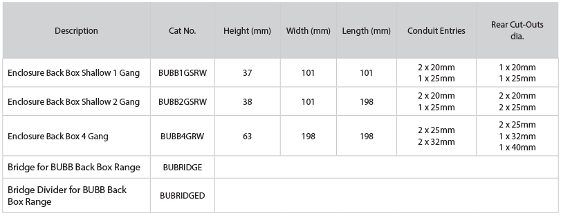 • Back Boxes 1 Gang Shallow, 2 Gang Shallow & 4 Gang