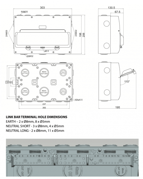 - Back Box has 8 x Ø 25mm & 5 x Ø 32mm conduit entries and 2 x 40mm, 2 x 32mm & 2 x 25mm Ø rear cut-outs.