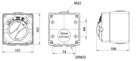 - Switch supplied with a large, easy to use knob, suitable for use with heavy industrial gloves. Has a positive, rotary action.