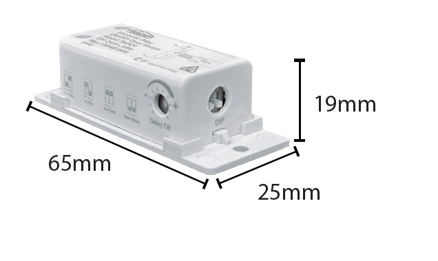 - Control settings are adjusted via combinations of two dip switches for the time periods and delay-on and delay-off fine-tuned with two potentiometers
