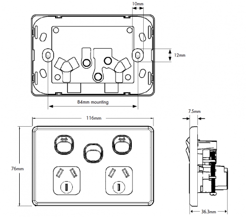 - Fits recessed Australian wall boxes and mounting accessories that use 84mm mounting centres.