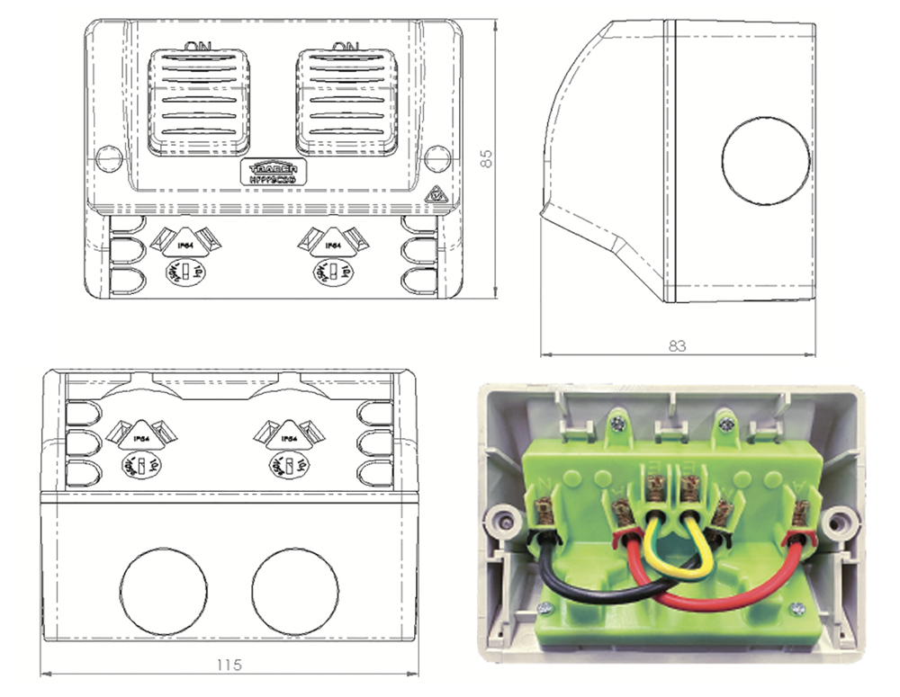 • Other features of the product include the removable caps adjacent to the socket faces that are designed to be replaced with IPA studs for easy circuit identification. This helps to speed up any circuit ID process as the hole positions are available from removing the existing plugs and will maintain the IP54 rating when replaced with the IPA stud.
