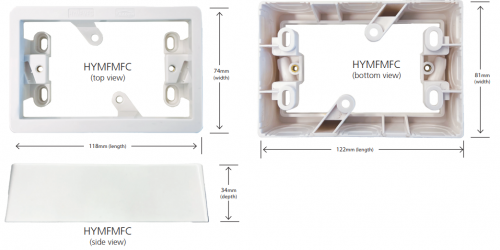 - HYMFMFC 34mm deep mounting flange with 84mm spaced brass metal threaded inserts, recessed to suit Flat Cat GPO’s and Switches.