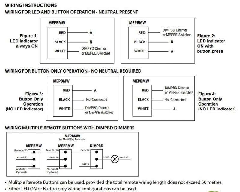 The MEPBMW will operate without neutral connected but the LED indicator will not function. Multiple MEPBMW can be connected in parallel to a single dimmer or a single 3-wire electronic switch, provided the total length of the remote connection does not exceed 50 metres.