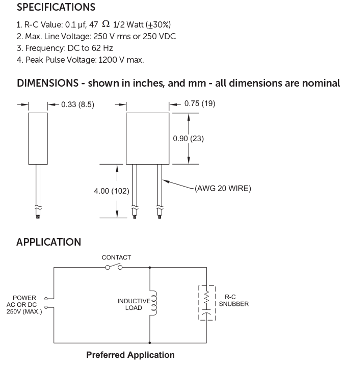 The R-C Snubber is intended to suppress the “inductive kick” from motors, solenoids or relay coils. High energy noise spikes are generated whenever current is interrupted through an inductive load. These noise spikes may interfere with associated equipment causing erratic operation and may also accelerate relay contact wear. Applied across an inductive load, the R-C snubber suppresses the noise spikes and extends contact life.