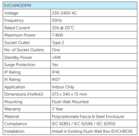 - Easily installed into ‘Box Ahead’ (EVCHBOX)