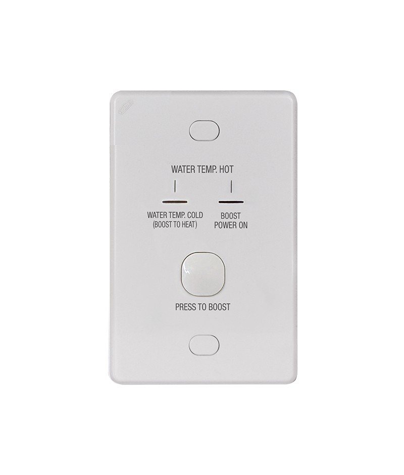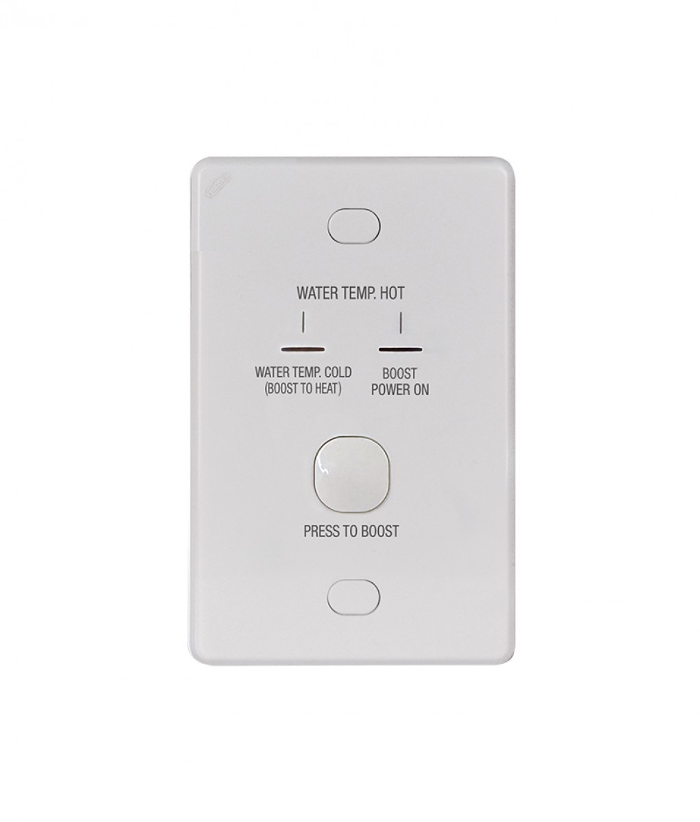 Indicator lights on the front plate give the status of the hot water system, ie: Hot, Cold or Boost Required.