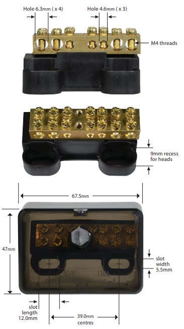 - Dimensions: 67.5 x 47 x 47mm. Mounting centres: 39mm with 12 x 5.5 mm slots.